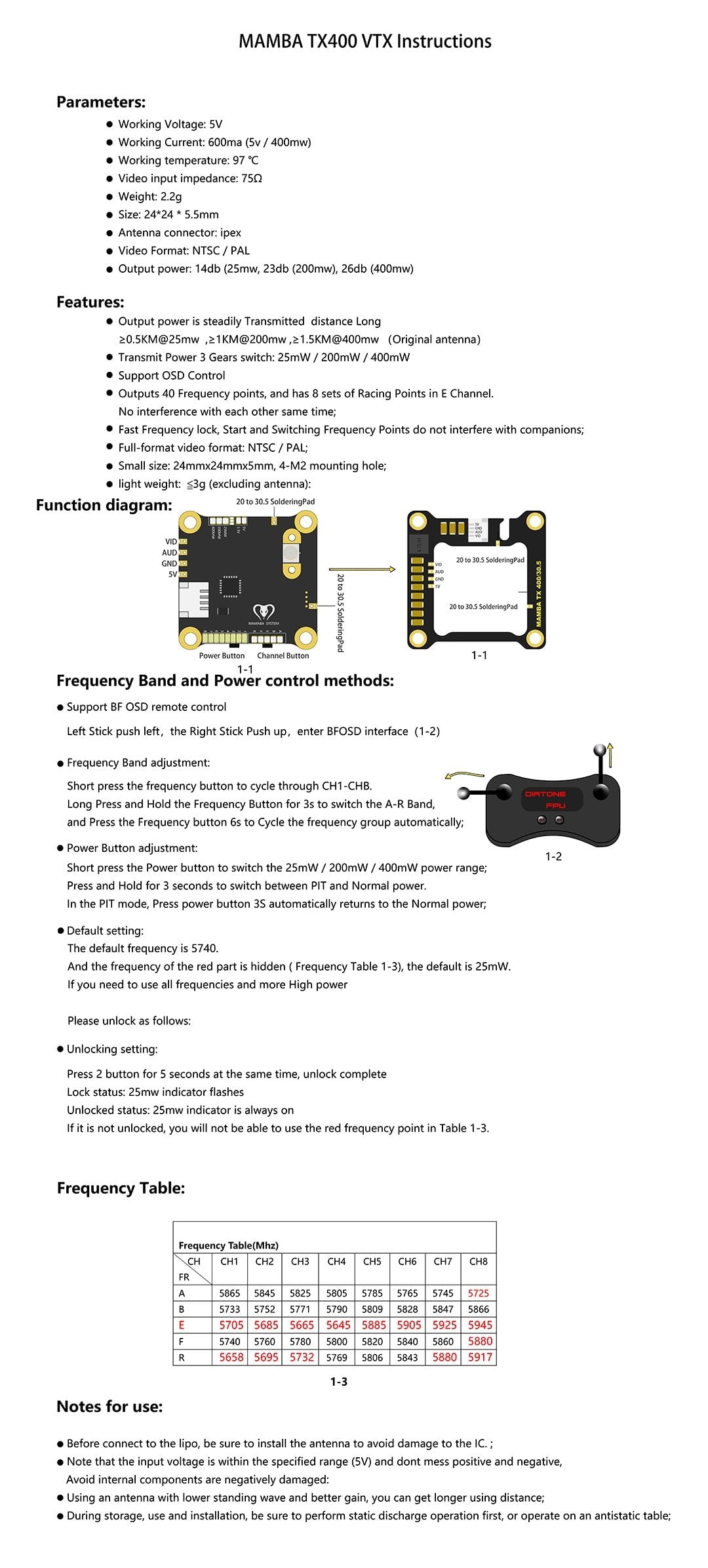 - Output Power: 14db (25mw) ,23db (200mw), 26db (400mw)