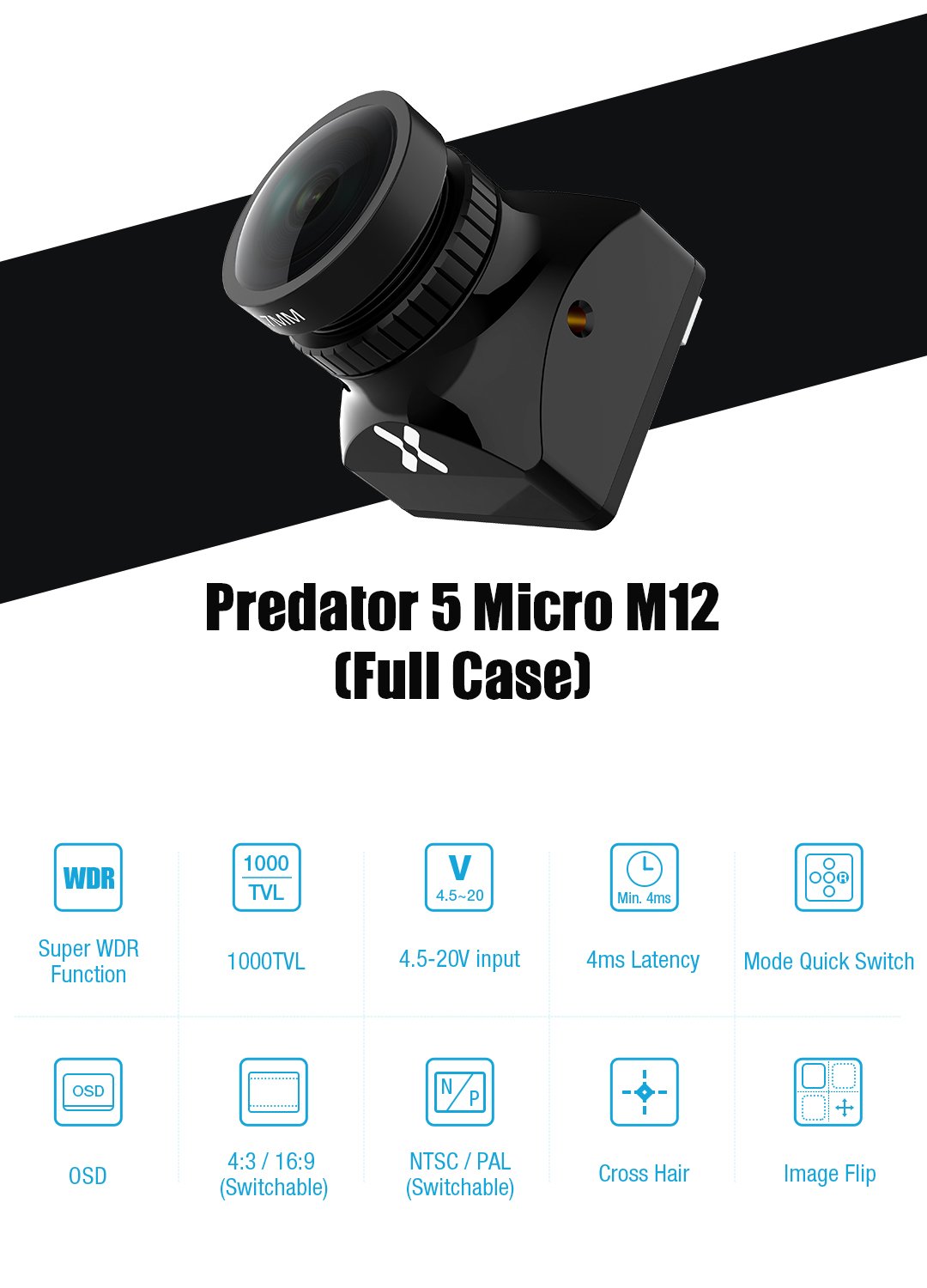 The Predator 5 Micro 1000TVL M8 is a 19x19mm FPV camera by Foxeer. This camera features a 1/3" CMOS sensor, 1000TVL resolution, 4ms latency, NTSC/PAL switchable, image flip, super WDR function, and many other cool features! Compare to the Predator 4, the Predator 5 has a more natural image, and it is also exclusive for LEDs.