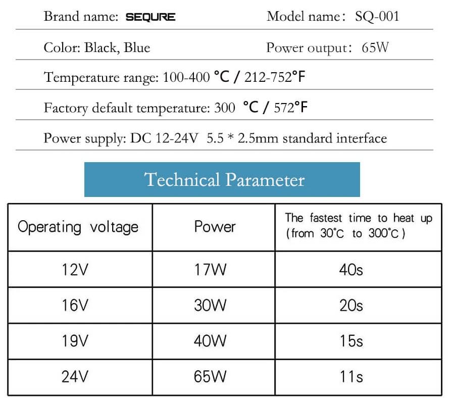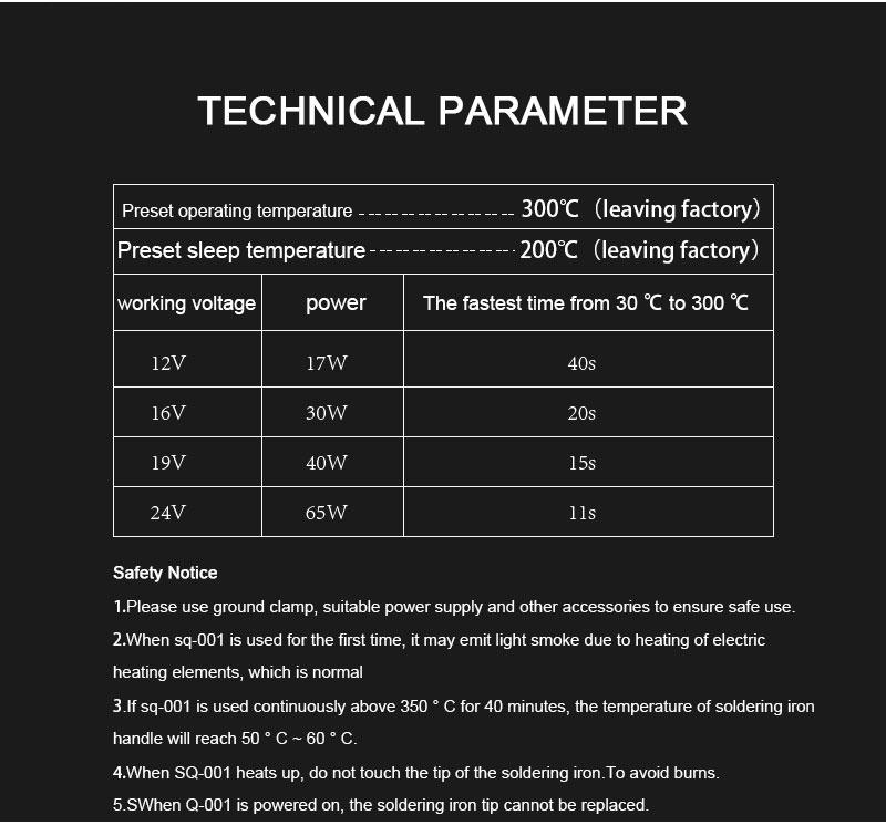 It can work in DC 12-24V. OLED screen display, key temperature adjustment, external independent power supply. In DC 19V 40W state, 15 seconds temperature rise