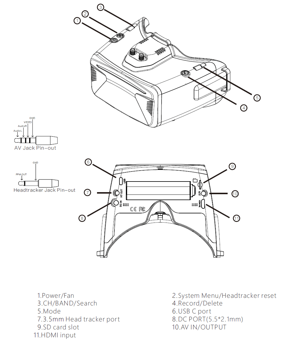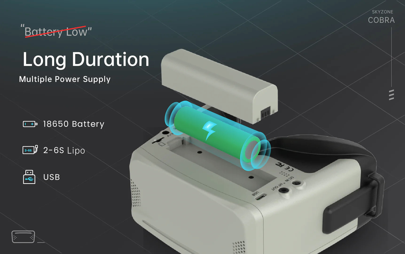 These goggles can be powered by a 18650 1 cell battery or 2~6s LiPo battery. USB and DC charging make these goggles simple to use in the field.