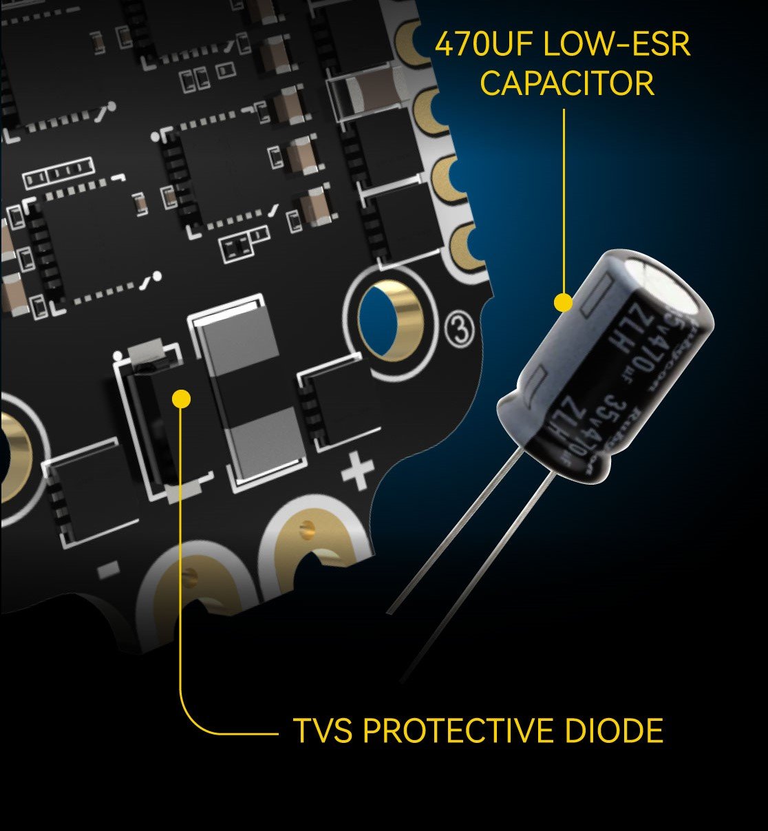 🛡 Upgraded Protection : We've pulled out all stops with our onboard TVS transient suppression diode. This bad boy gobbles up surge voltage, offering the ESC some much-needed TLC. Toss in a Rubycon 470uF Low-ESR capacitor, and you have an ESC that's prepped and ready for anything.