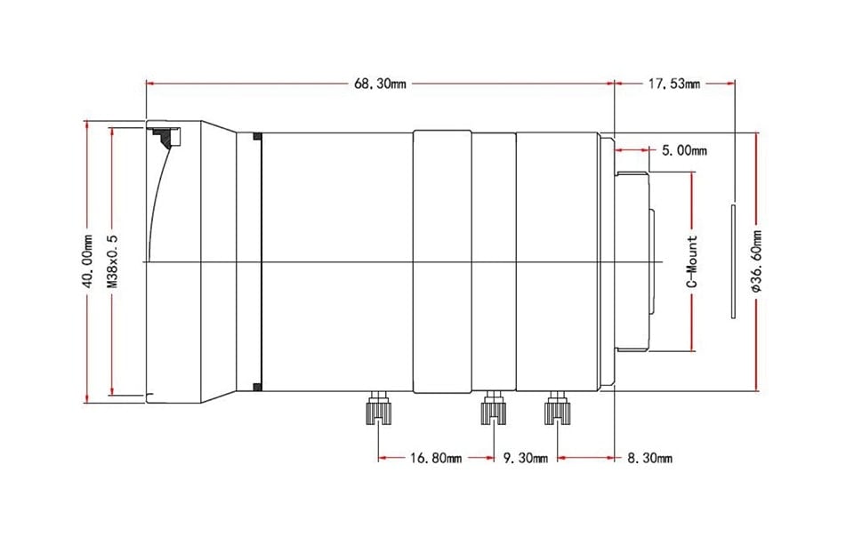 This is a high quality industrial adjustable zoom lens that easily attaches to the Raspberri Pi 12.3MP Camera Sensor , 8-50mm Focal Length, C-Mount, Compatible IMX477 C mount sensors.