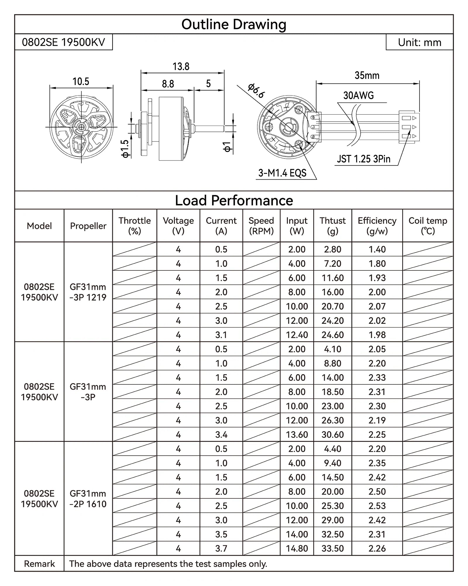 - Compared with 0802 19500KV brushless motors, 0802SE 19500KV is reduced by 0.15g, which is only 1.8g. While it is used on a 65mm/75mm drone, pilots can get a more flexible flight and fly longer.