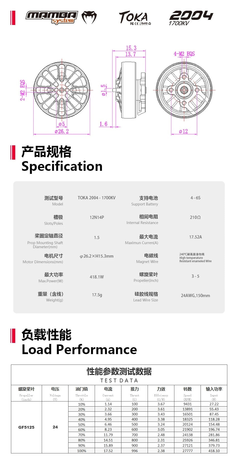 The Mamba Toka 2004 Motor is part of a new series of motors by Diatone that is best suited for CineWhoops, like the Diatone MX-C Taycan or any 3"-4" builds! Choose between two KVs to best fit your FPV needs: 1700KV, or 2900KV.