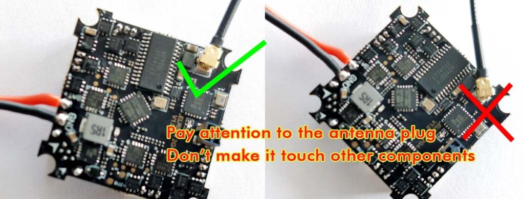 Notes: Due to the high-power VTX onboard, the temperature of the AIO flight controller will be relatively high in the standby state, and the camera signal may be lost after a couple of minutes standby. This is a normal phenomenon, please don’t worry. We strongly recommend using a fan to cool down when setting up the flight control. Please make sure the vtx antenna was plugged before power for the AIO flight controller.