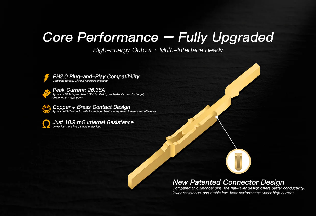 That’s right. You get a connector that uses a solid pin (pure copper on the drone side, enlarged brass on the battery side) for massive conductivity gains, but you can still jam it into your existing PH2.0 chargers without an adapter. It’s the engineering equivalent of having your cake and eating it too.