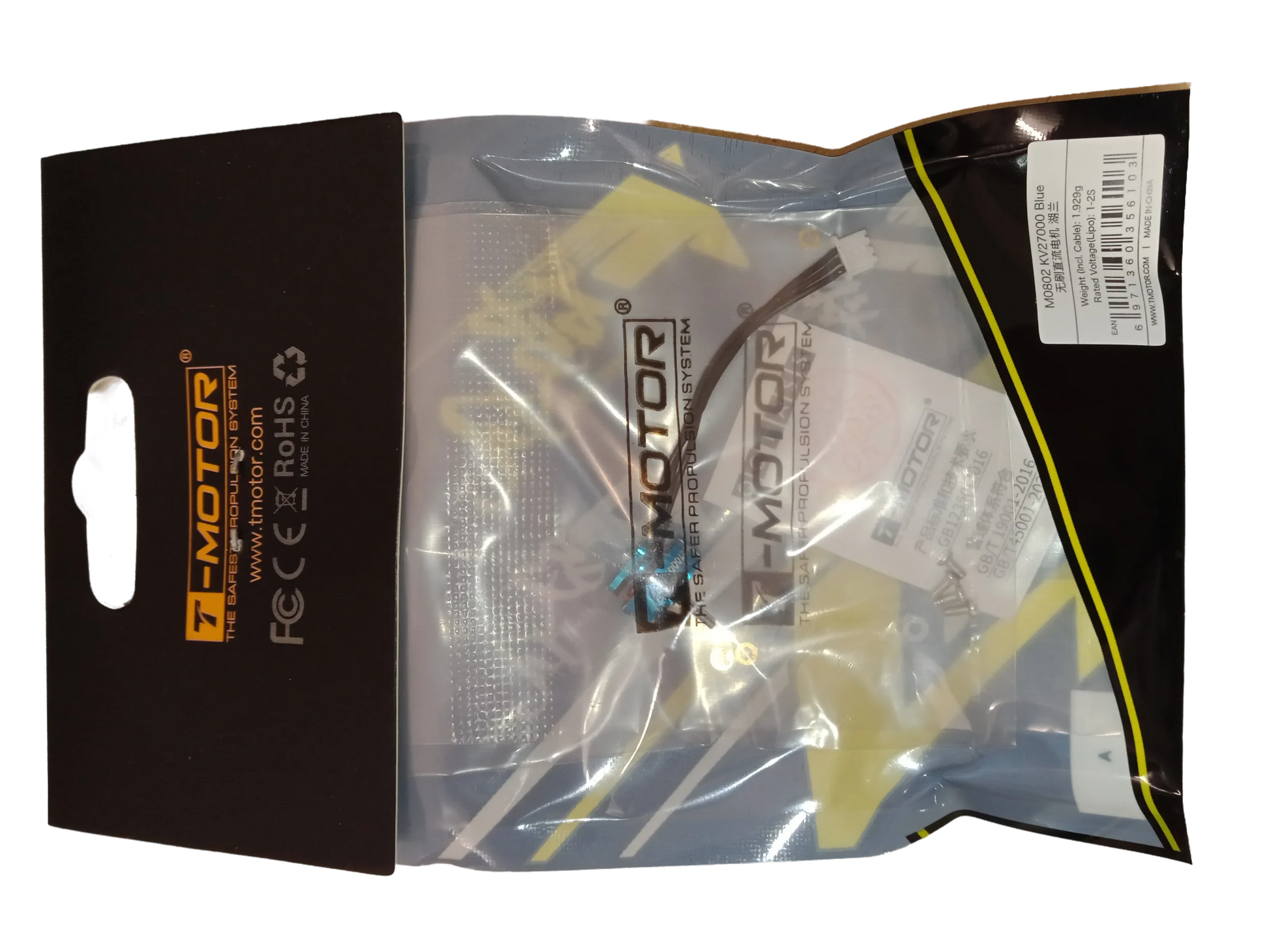 This is a new, never-used T-MOTOR M0802 KV27000 Blue brushless motor, still in its original packaging. It's an older version of the T-MOTOR 0802 series, ideal for lightweight micro FPV builds, especially those using 1S or 2S LiPo batteries. The motor weighs 1.929g including the cable. It promises reliable performance from a reputable brand in the drone industry. Perfect for hobbyists looking for a spare or to build a custom micro drone.