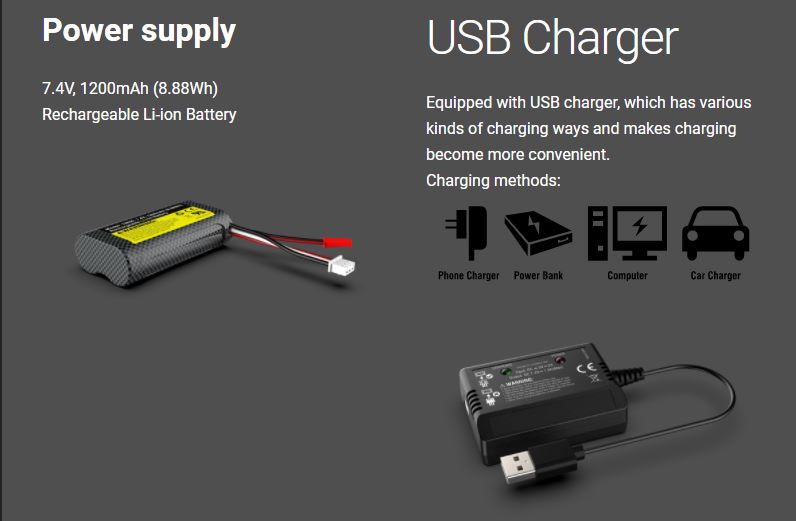 - 7.4V, 1200mAh (8.88Wh) Rechargeable Li-ion Battery